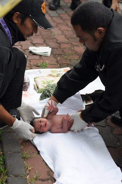 | Bayi sedang diangkat untuk transfer ke dalam selimut yang bersih....kebetulan ada orang ramai yang ada anak kecil...dermakan kain selimut... |